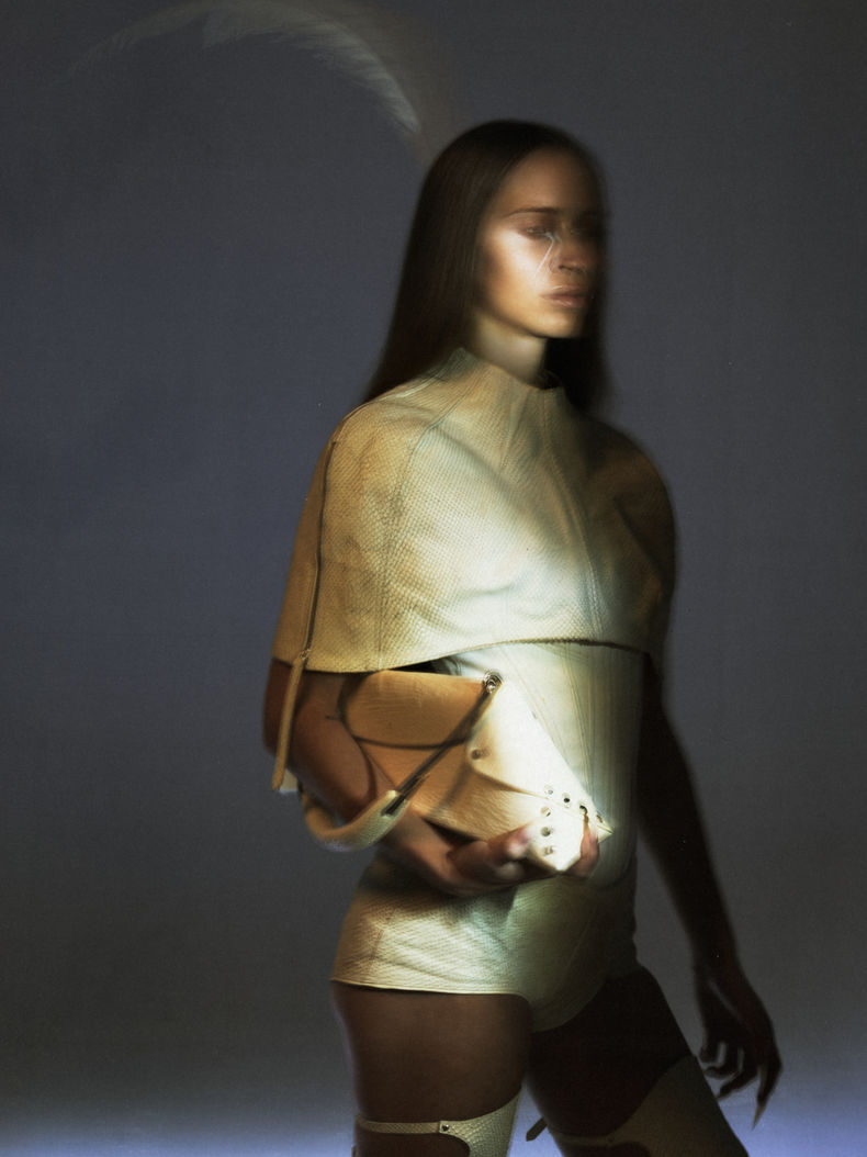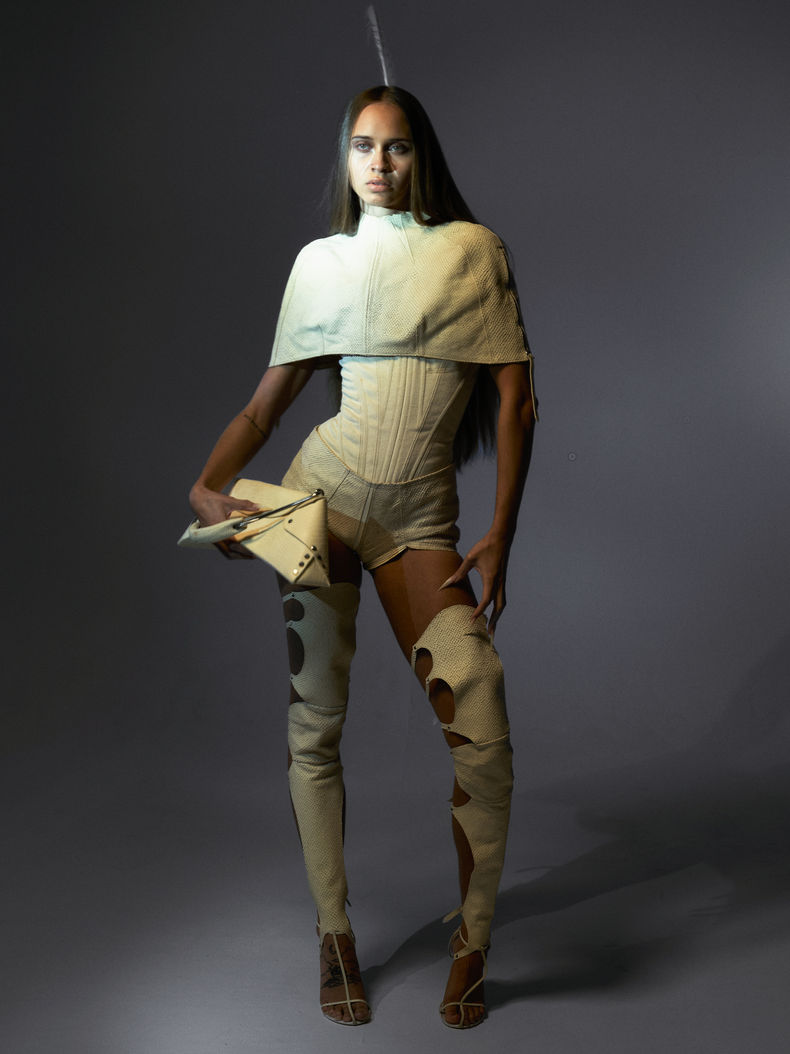 PHOENIX amplifies previous explorations of leather, pushing forward artisanal methods, softly sculpting through curves and geometry. Materials are strengthened to become sculptural foundations, leather carefully hand cut to blur the lines between natural feathers used throughout the collection, and the ones constructed and manipulated by hand. Feminine forms are shielded through boned channels and fortified seams, projecting outwards as armor, yet at times cut to reveal a sliver running through the heart meridian, with delicate feather atop bare seeming skin. Quotidien materials like power mesh and nylon hosiery, a through-line from previous RTW collections, are reconsidered with draping techniques and couture finishings, carefully pleated, hand tacked atop shoulder structures, and knotted with traditional techniques in this new rendering of ORIENS.